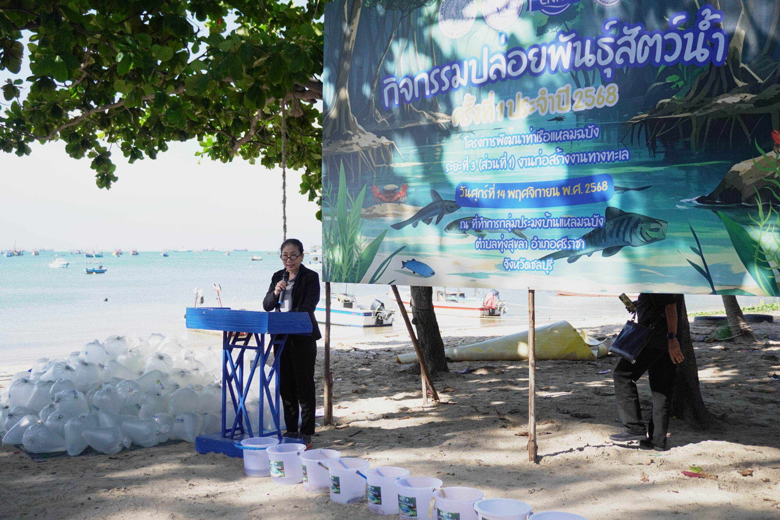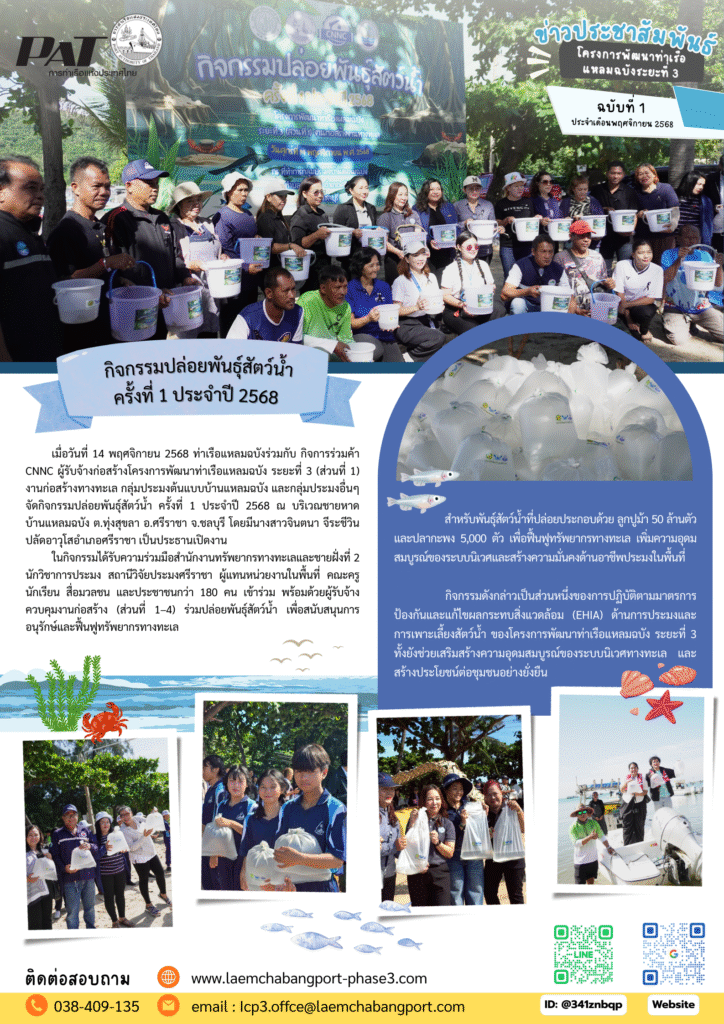 เมื่อวันที่ 14 พฤศจิกายน 2568 ท่าเรือแหลมฉบังร่วมกับ กิจการร่วมค้า CNNC ผู้รับจ้างก่อสร้างโครงการพัฒนาท่าเรือแหลมฉบัง ระยะที่ 3 (ส่วนที่ 1) งานก่อสร้างทางทะเล กลุ่มประมงต้นแบบบ้านแหลมฉบัง และกลุ่มประมงอื่นๆ จัดกิจกรรมปล่อยพันธุ์สัตว์น้ำ ครั้งที่ 1 ประจำปี 2568 ณ บริเวณชายหาดบ้านแหลมฉบัง ต.ทุ่งสุขลา อ.ศรีราชา จ.ชลบุรี โดยมีนางสาวจินตนา จีระชีวิน ปลัดอาวุโสอำเภอศรีราชา เป็นประธานเปิดงาน