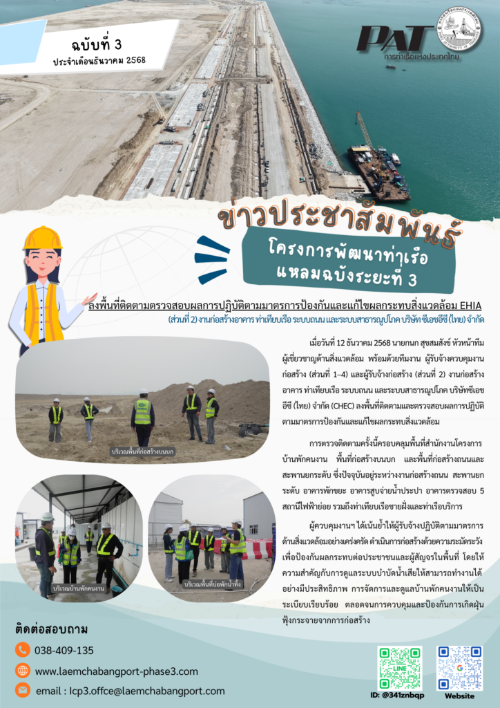 เมื่อวันที่ 12 ธันวาคม 2568 นายกนก สุขสมสังข์ หัวหน้าทีมผู้เชี่ยวชาญด้านสิ่งแวดล้อม พร้อมด้วยทีมงาน ผู้รับจ้างควบคุมงานก่อสร้าง (ส่วนที่ 1–4) และผู้รับจ้างก่อสร้าง (ส่วนที่ 2) งานก่อสร้างอาคาร ท่าเทียบเรือ ระบบถนน และระบบสาธารณูปโภค บริษัทซีเอชอีซี (ไทย) จำกัด (CHEC) ลงพื้นที่ติดตามและตรวจสอบผลการปฏิบัติตามมาตรการป้องกันและแก้ไขผลกระทบสิ่งแวดล้อม