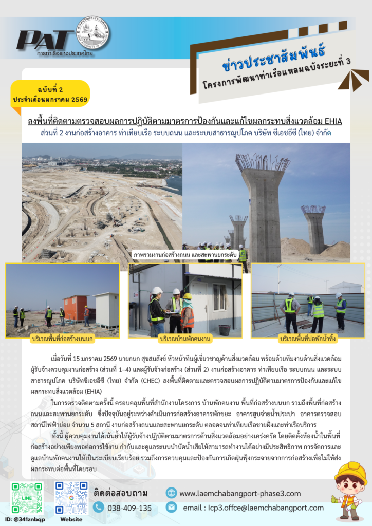 ลงพื้นที่ติดตามตรวจสอบผลการปฏิบัติตามมาตรการป้องกันและแก้ไขผลกระทบสิ่งแวดล้อม EHIA ประจำเดือนมกราคม 2569 (ส่วนที่ 2) งานก่อสร้างอาคาร ท่าเทียบเรือ ระบบถนน และระบบสาธารณูปโภค