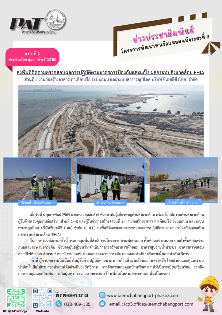ลงพื้นที่ติดตามตรวจสอบผลการปฏิบัติตามมาตรการป้องกันและแก้ไขผลกระทบสิ่งแวดล้อม EHIA ประจำเดือนกุมภาพันธ์ 2569 (ส่วนที่ 2) งานก่อสร้างอาคาร ท่าเทียบเรือ ระบบถนน และระบบสาธารณูปโภค