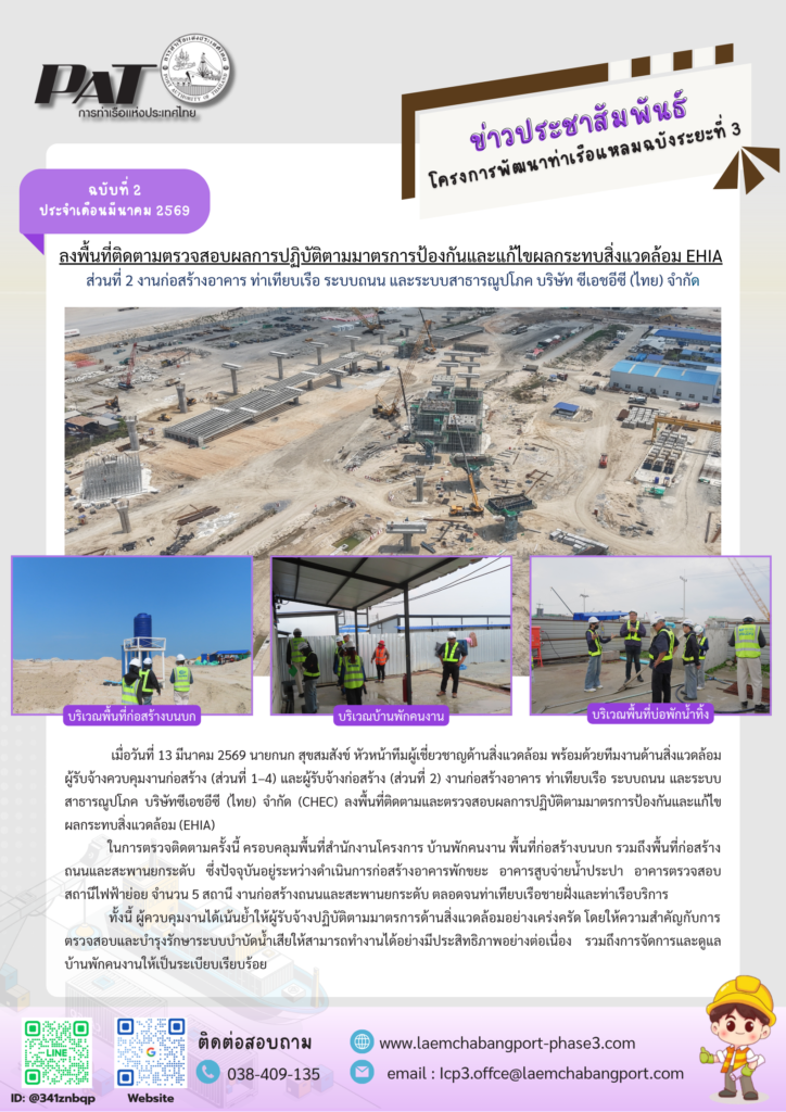 ลงพื้นที่ติดตามตรวจสอบผลการปฏิบัติตามมาตรการป้องกันและแก้ไขผลกระทบสิ่งแวดล้อม EHIA ประจำเดือนมีนาคม 2569 (ส่วนที่ 2) งานก่อสร้างอาคาร ท่าเทียบเรือ ระบบถนน และระบบสาธารณูปโภค