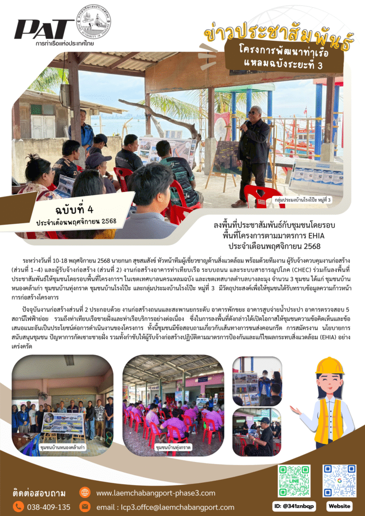 ระหว่างวันที่ 10-18 พฤศจิกายน 2568 นายกนก สุขสมสัมข์ หัวหน้าทีมผู่เชี่ยวชาญด้านสิ่งแวดล้อม พร้อมด้วยทีมงาน ผู้รับจ้างควบคุมงานก่อสร้าง (ส่วนพี่ 1-4) และผู้รับจ้างก่อสร้าง (ส่วนที่ 2) งานก่อสร้างอาคารท่าเทียบเรือ ระบบถนน และระบบสาธารณูปโภค (CHEC) ร่วมกันลงพื้นที่ประชาสัมพันธ์ให้ชุมชนโดยรอบพื้นที่โครงการฯ ในเขตเทศบาลนครแหลมฉบัง และเขตเทสบาลตำบลบางละมุง จำนวน 3 ชุมชน ได้แก่ ชุมชนบ้านหนองคล้าเก่า ชุมชนบ้านทุ่งกราด ชุมชนบ้านโรงโป๊ะ และกลุ่มประมงบ้านโรงโป๊ะหมู่ที่ 3 มีวัตถุประสงค์เพื่อให้ชุมชนได้รับทราบข้อมูลความก้าวหน้าการก่อสร้างโครงการ