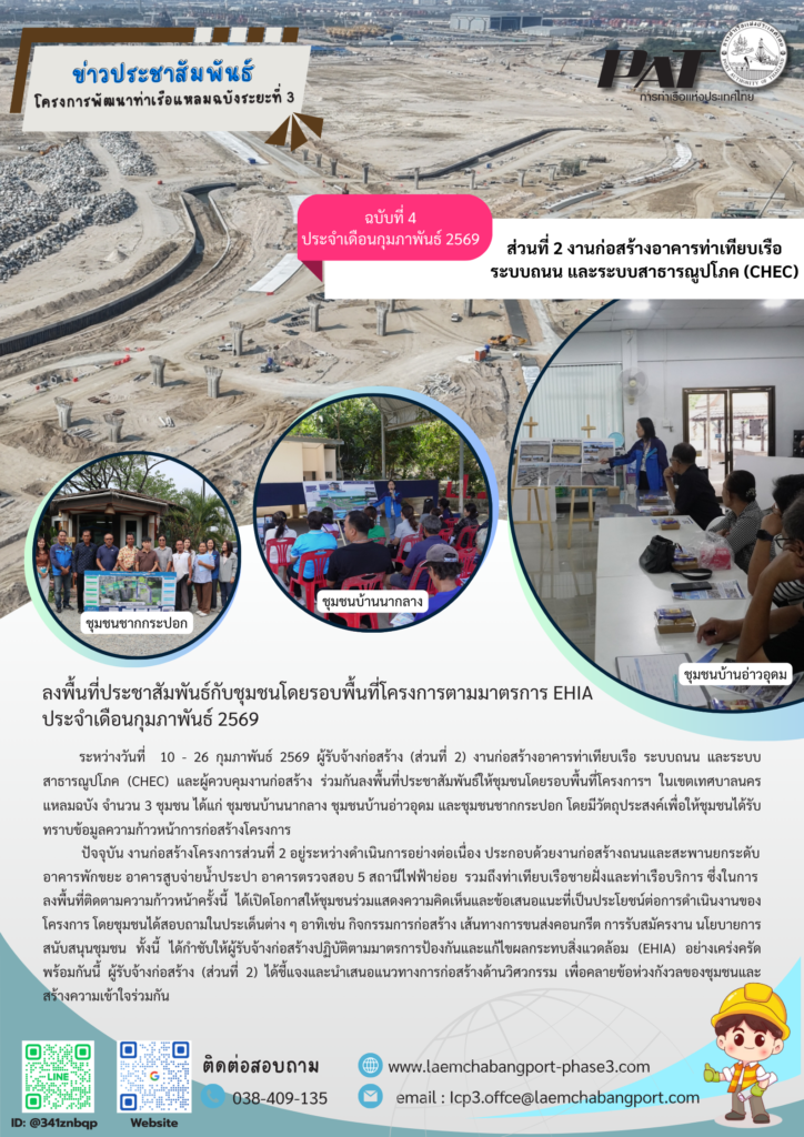 ระหว่างวันที่ 10-26 กุมภาพันธ์ 2569 ผู้รับจ้างก่อสร้าง (ส่วนที่ 2) งานก่อสร้างอาคารท่าเทียบเรือ ระบบถนน และระบบสาธารณูปโภค (CHEC) และผู้ควบคุมงานก่อสร้าง ร่วมกันลงพื้นที่ประชาสัมพันธ์ให้ชุมชนโดยรอบพื้นที่โครงการฯ ในเขตเทศบาลนครแหลมฉบัง จำนวน 3 ชุมชน ได้แก่ ชุมชนบ้านนากลาง ชุมชนบ้านอ่าวอุดม และชุมชนชากกระปอก โดยมีวัตถุประสงค์เพื่อให้ชุมชนได้รับทราบข้อมูลความก้าวหน้าการก่อสร้างโครงการ